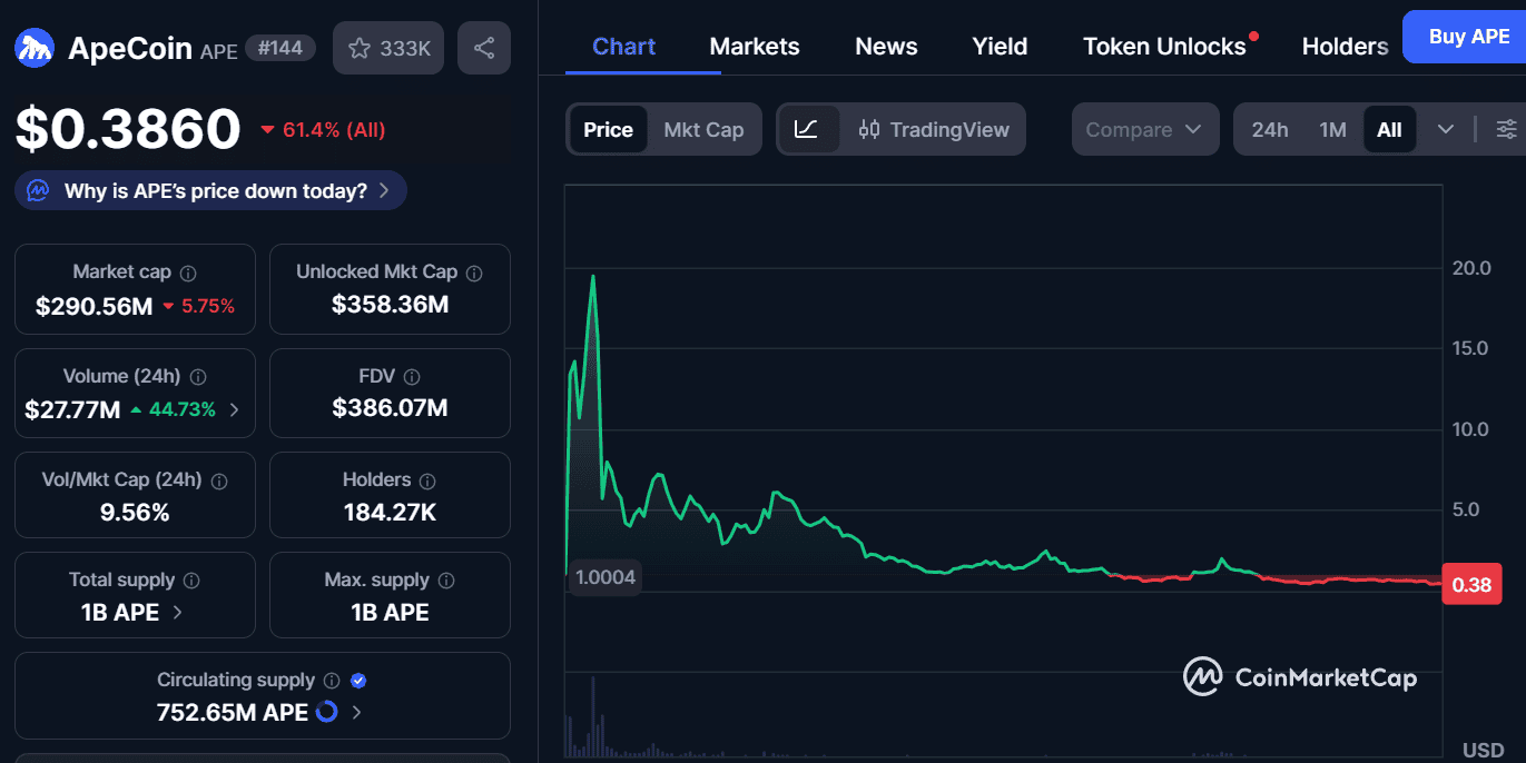 APE currently trades at $0.3876, with a 24-hour volume of $27.89 million, marking a 46% jump despite price weakness. The market cap stands at $291.79 million, while the fully diluted value hovers near $387 million.