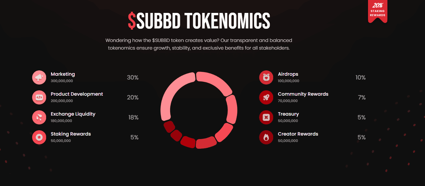 - Tokens Sold: 20% of total supply (1B SUBBD, ~200M tokens)
