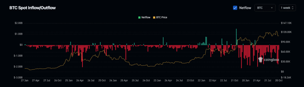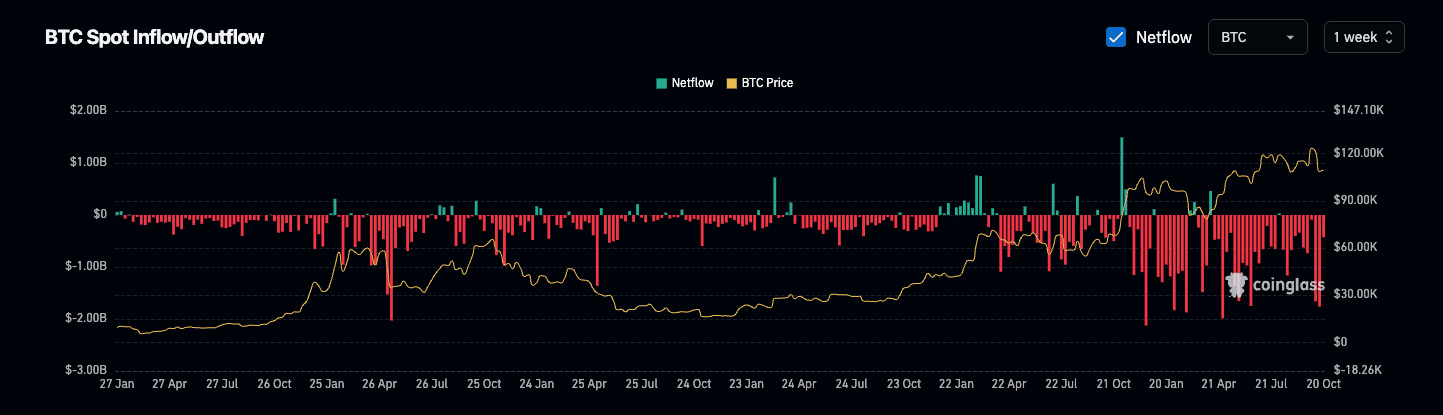Net exchange outflows support the HODL narrative as evidence from CoinGlass shows persistent BTC spot netflow negatives across recent windows (outflows > inflows on several major venues).