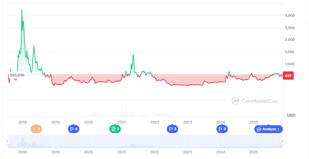 Bitcoin Cash, created initially as a faster, more scalable extension of early blockchain principles, continues to play a steady role in the broader market. BCH trades at $497.30, with a market cap of $9.92 billion and a 24-hour volume of $576.73 million. Pricing shows a 1.92% increase over the past day. However, its weekly performance reflects a 4.72% decrease. Over the past month, BCH rose 3.26%, and over the past year, it increased by 11.07%. These trends mirror the cycle behavior noted by research groups, which highlight that established networks often move in steady patterns while newer tokens experience sharper volatility.