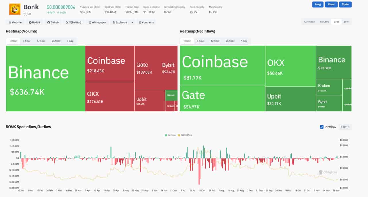Bonk’s volume heatmap indicates that Binance leads in trading volume at 636.74K, far above Coinbase at 218.43K and Gate at 139.08K. This suggests that Binance remains a speculative center wherein rapid rotations shape the short-term structure.
