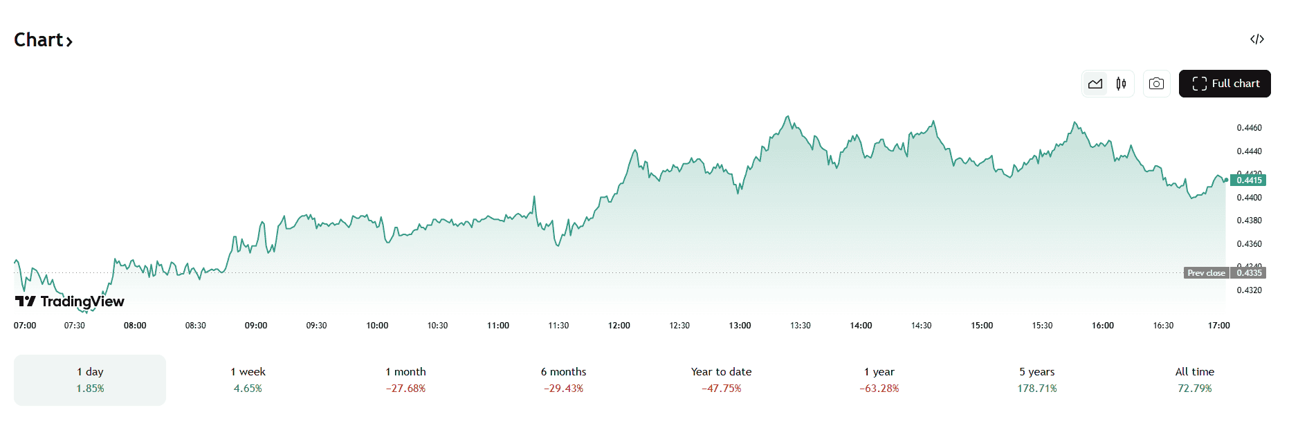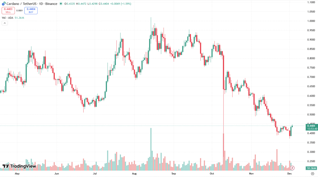 ADA is currently trading in the $0.43–0.44 range, with recent sessions showing relatively stable price behavior based on CoinMarketCap data. Market capitalization is seen at close to $15.82 billion, and spot trading volume is close to 200 million, which confirms the existence of market players despite subdued volatility.
