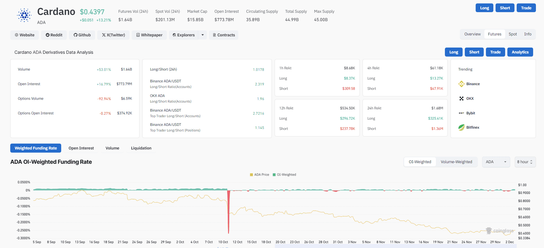 Cardano ADA +13.23% is trading in the $0.43–0.44 range, while derivatives data show a neutral structure based on current Open Interest and volume readings.