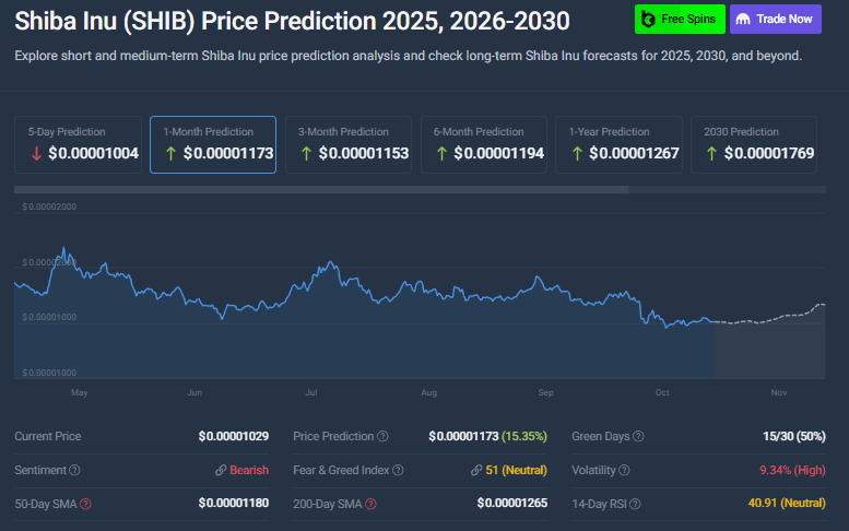 Even with weak momentum, SHIB is still holding its support level. Analysts following the Shiba Inu coin price prediction 2025 see a moderate recovery potential if volume returns, though short-term technicals stay mixed.