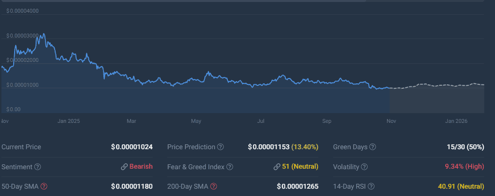Shiba Inu price prediction continues to trade flat near $0.00001018, with weak upside pressure and no breakout signal in sight. Momentum indicators show sideways action, and trading volume has fallen across major exchanges.