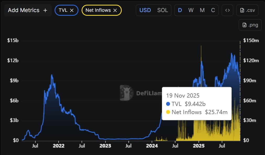 According to DefiLlama, Solana currently holds $9.42B in TVL, supported by strong on-chain activity across metrics such as DEX Volume, Chain Fees, App Revenue, and Active Addresses. The Net Inflows (24h) indicator has shown several consecutive periods of reduced inflows, which aligns with the continued drop in exchange-accessible liquidity.