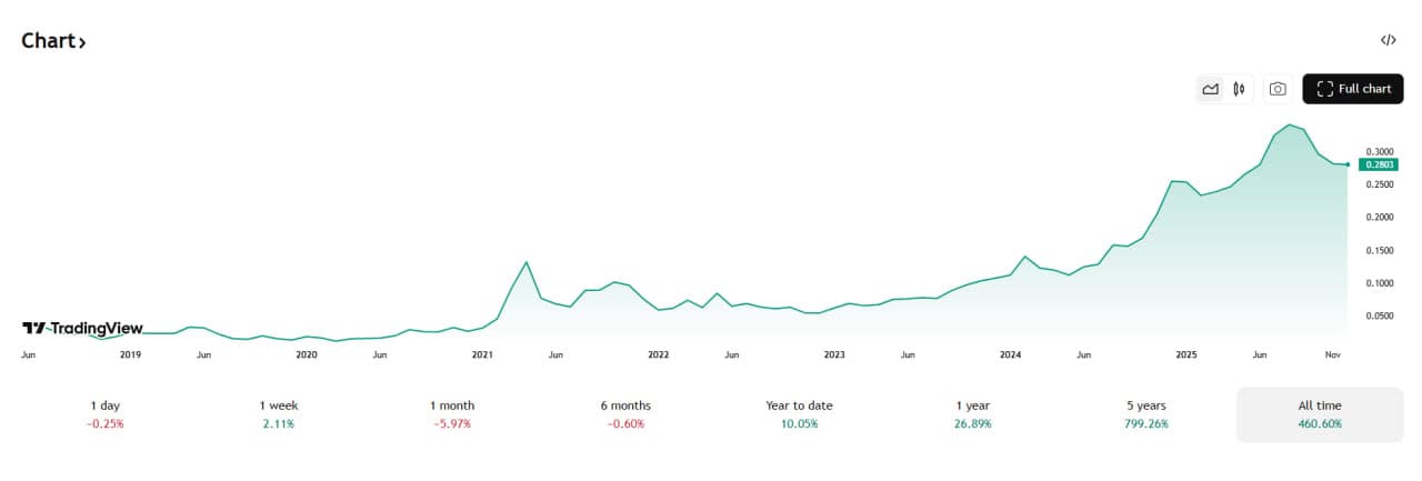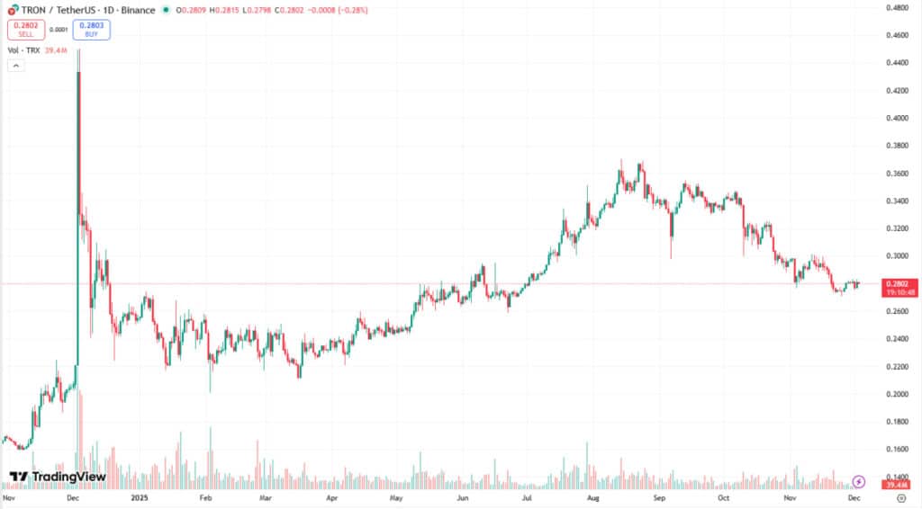 TRON (TRX) is currently trading at around $0.280, with sideways price action throughout the latest sessions. On CoinMarketCap, 24-hour trading volume is nearly $650–660 million, as market participants continue to show interest in this market. Market capitalization lies close to $26.5 billion, ranking TRX among the largest altcoins.