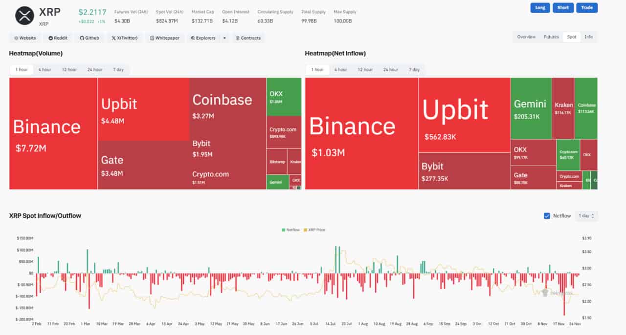 The XRP exchange volume map places Binance at 7.72 million USD, Upbit at 4.48 million USD, and Coinbase at 3.27 million USD. This distribution indicates strong liquidity concentration across majors. High-volume clusters contribute to supporting predictable price behavior in phases of high volatility.